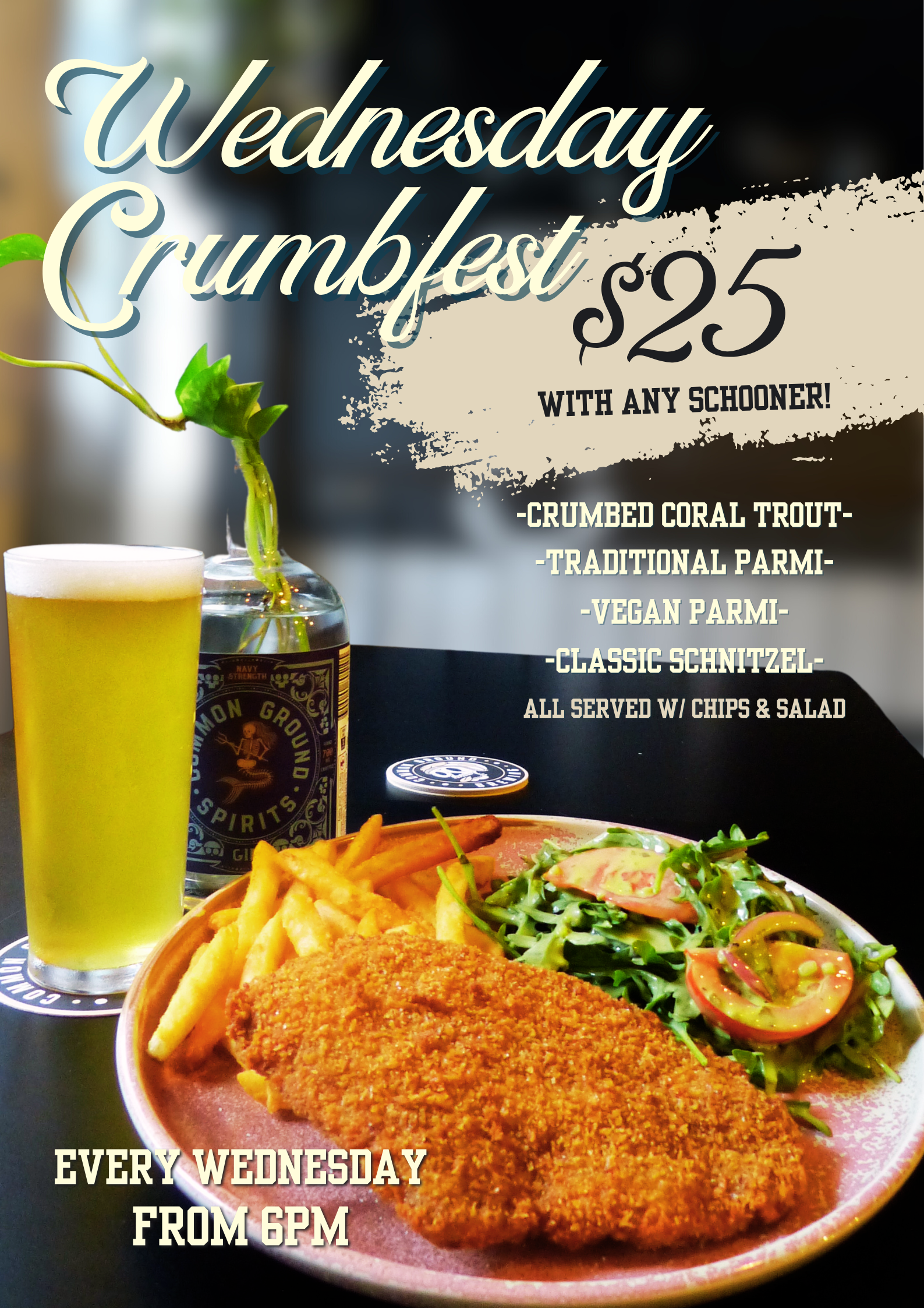 For just $25, you can indulge in a mouthwatering selection of crumbed goods! Choose between a Traditional Parmi, Crispy Classic Chicken Schnitty, Mouth Watering Crumbed Coral Trout, or a Vegan Parmi option for your non-meat-eating friends. Includes a schooner of any Common Ground Brew, made here on site!
